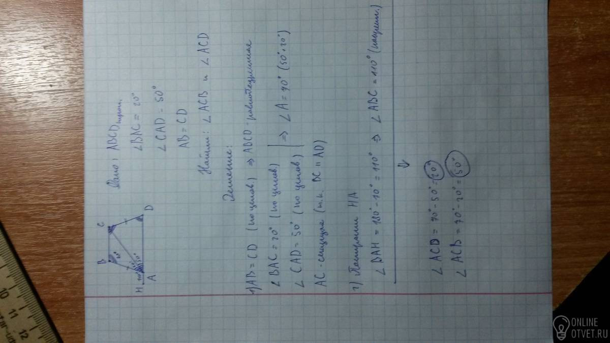 В трапеции ABCD известно,что AB=CD, угол BAC=20 градусов, угол CAD = 50 градусов. Найдите углы ACB и ACD