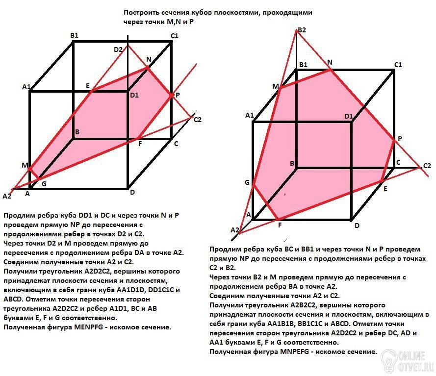 1) Продлим ребра куба DD1 и DС и через точки N и Р проведем прямую NP до пересечения с продолжениями ребер в точках D2 и C2.