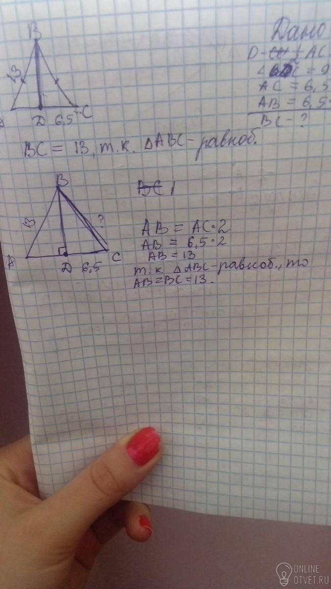 ABC-равнобедренный треугольник. точка D середина основания AC.эту точку соединили с вершиной B, оброзовавшийся угол ADB равен 90 градусов . длина стороны AC равен 6,5 см. стороны AB в 2 раза больше AC. найдите сторону BC