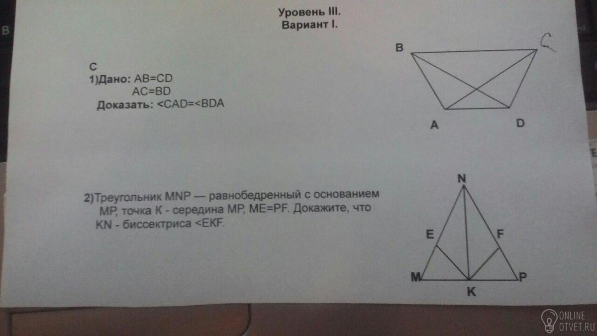 1)углы будут равны т,к. диагонали равны а сответственно и отрезки диагоналей равны ,значит треугольникАОД равнобедреный О точка пересечений диагоналей , в равнобедренном треугольнике углы при основании равны .