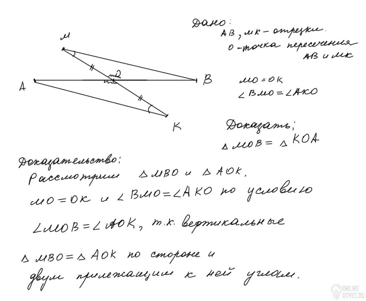Отрезки AB и MK пересекаются в точке O, которая является серединой отрезка MK, ∠BMO = ∠AKO.