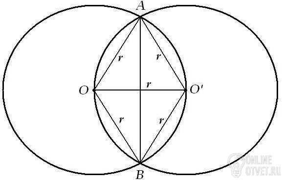 Одна из двух равных окружностей проходит через центр другой окружности.