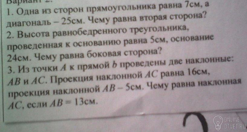 1.Сторона прямоугольника - это катет. √(25²-7²) = √576 = 24.