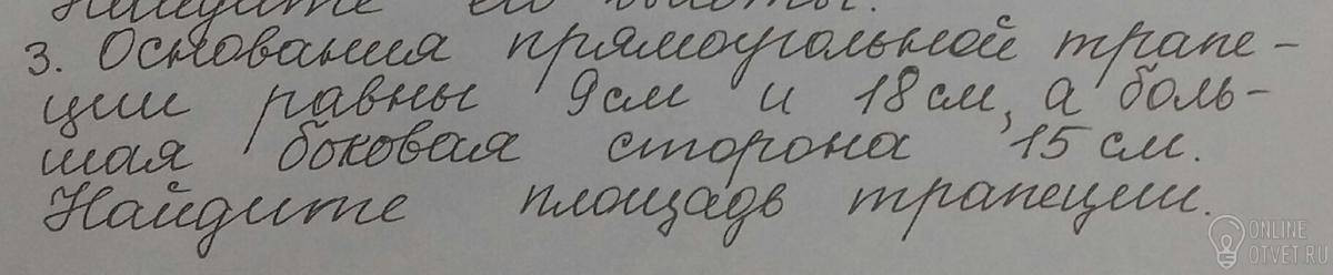 Проведем высоту трапеции из вершины тупого угла. У нас получится прямоугольный треугольник с гипотенузой 15 см, и катетом 18-9-9см.