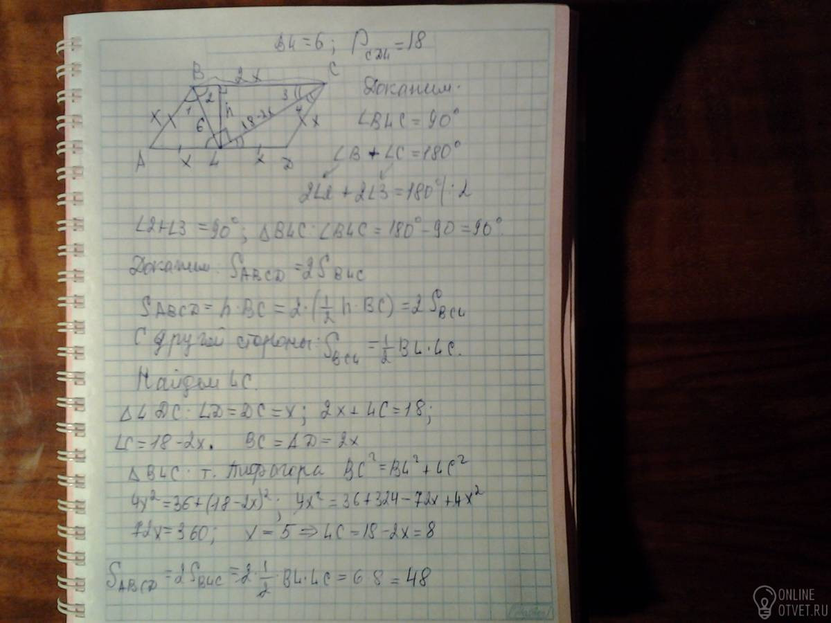 В параллелограмме abcd биссектрисы углов b и c пересекаются в точке l лежащей на стороне ad. найти площадь параллелограмма,если bl=6 периметр треугольника cdl=18