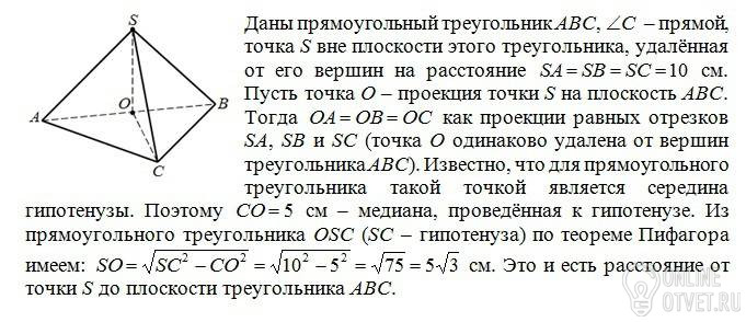 -Точка удалена от каждой из вершин прямоугольного треугольника на расстояние 10 см. На каком расстоянии от плоскости треугольника находится эта точка, если медиана, проведенная к гипотенузе, равна 5 см?