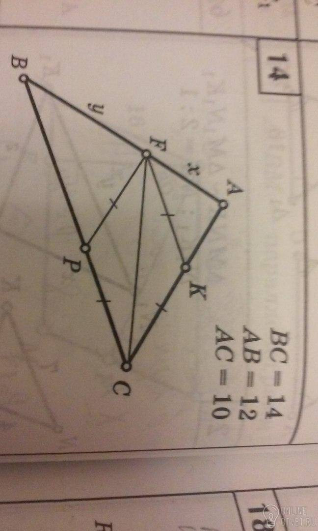 14) По чертежу видим две группы подобных (или как там у вас могут называться))) треугольников AFK~ABC и BPF~BCA, откуда, обозначив z помеченные штрихом отрезки, получим: