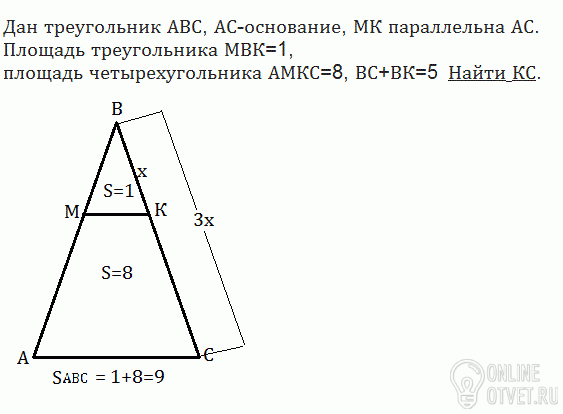Помогите решить! 50 баллов! дан треугольник АВС, АС-основание, МК параллельна АС. Площадь треугольника МВК=1, площадь четырехугольника АМКС=8, ВС+ВК=5 Найти КС. Ответ известен он равен 2,5