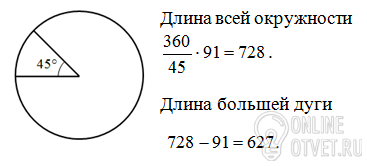 На окружности с центром 0 отмечено точки A и В твк что AОВ=45 длина меньшей дуги АВ =91 найдите длину большой дуги