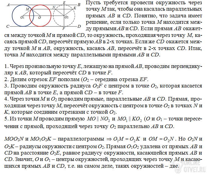 Даны две параллельные прямые и точка M не лежащая на них.Постройте окружность,проходящую через точку m и касающуюся данных прямых
