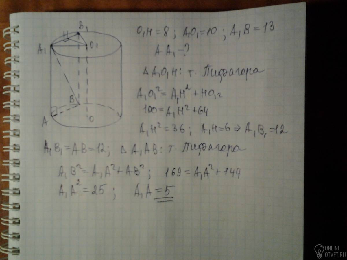 Паралельно осі циліндра на відстані 8 см від неї проведено переріз діагональ якого 13 см. Обчисліть висоту циліндра якщо радіус його основи 10 см