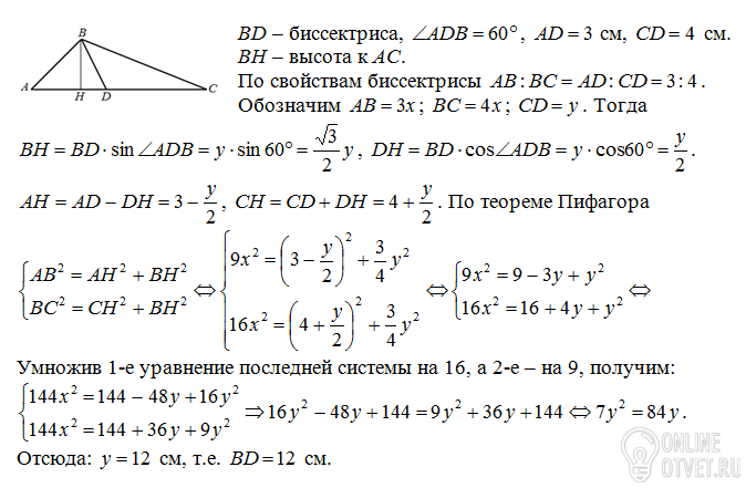 Знайдіть бісектрису трикутника, яка поділяє його сторону на відрізки 3 см і 4 см та утворює з цією стороною кут, що дорівнює 60 градусам.