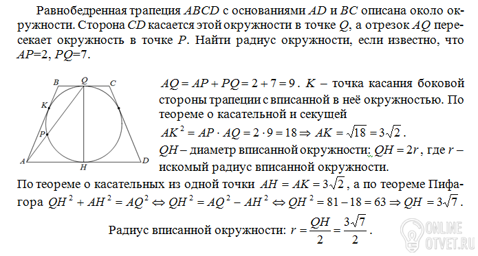 окружность в точке P.Найти радиус окружности,если известно,что AP=2, PQ=7