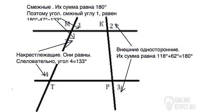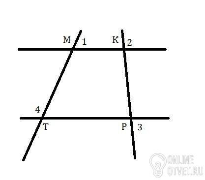 Угол 2 и угол 3 - внешние односторонние. Их сумма равна 118°+62°=180°. Если сумма внешних или внутренних односторонних углов при пересечении двух прямых секущей равна 180°, то эти прямые параллельны. ⇒МК║ТР⇒