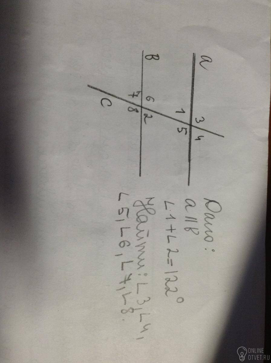 1)угол 1 и угол 2 - накрест лежащие=> Пусть <1=<2=х Составим ур-е: х+х=122 2х=122 х=61 Следовательно, угол 1=углу 2=61 градусу 2)<1 и <1+<6=180 61+<6=180 <6=119 3)<6 и <6=<3=119 4) <4 и <4=<2=61 5) <5 и <5=<6=119 6) <7 и <7=<1=61 7)<8=<5=119 (как соответственные углы) Ответ: <1=61, <2=61, <3=119, <4=61, <5=119, <6=119, <7=61, <8=119