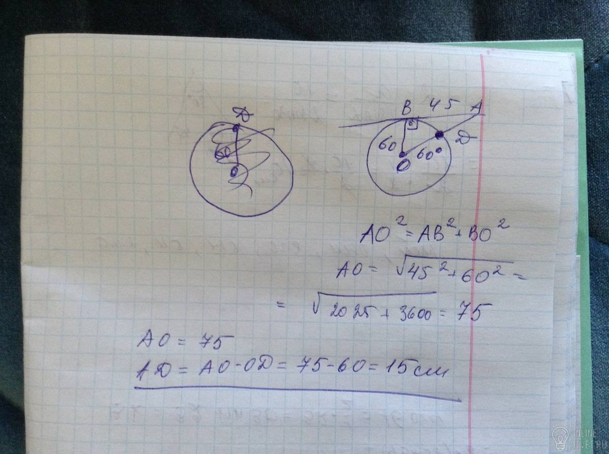 Отрезок ав=45 касается окружности радиуса 60 с центром о в точке в Окружность пересикает отрезок АО в точке Д. Найдите Ад