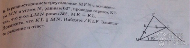 Как доказать параллельность точно не знаю, но, если доказать, то углы KLF=MNF равны по 60°, угол MLN=180-(30+60)=90°, тогда угол KLM=180-(60+90)=30°