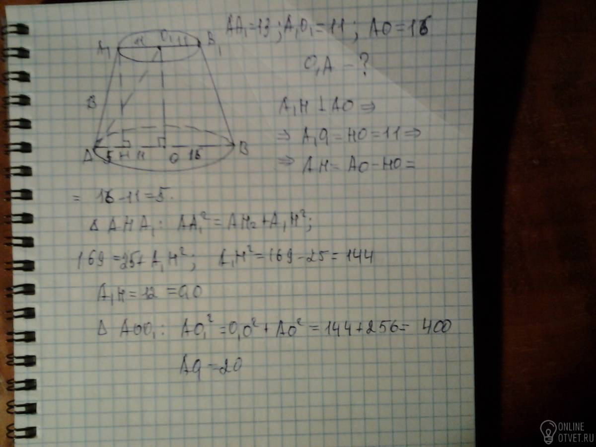 Радиусы оснований усеченного конуса равны 11 и 16 см образующая = 13 см найдите расстояние от центра меньшего основания к точке круга большего основания