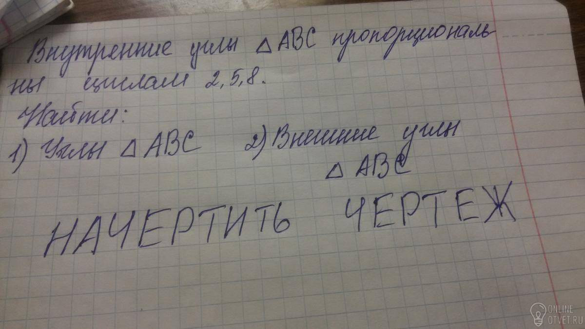 1) 2х+5х+8х=180; 15х=180; х=180:15; х=12, 2•12=24( угол 1) , 5•12=60(угол 2), 8•12=96(угол 3);;;2) 180-24=156(1 внешний угол), 180-60=140( 2 внешний угол), 180-96=84(3 внешний угол)