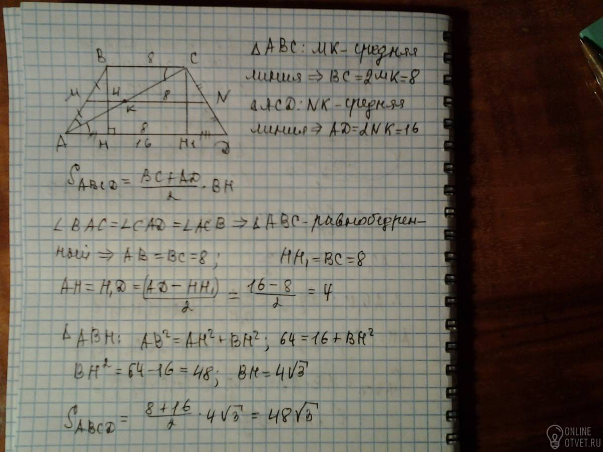 У рівнобічній трапеції діагональ є бісектрисою гострого кута і поділяє середню ліінію на відрізки 4 і 8 . знайдіть площу