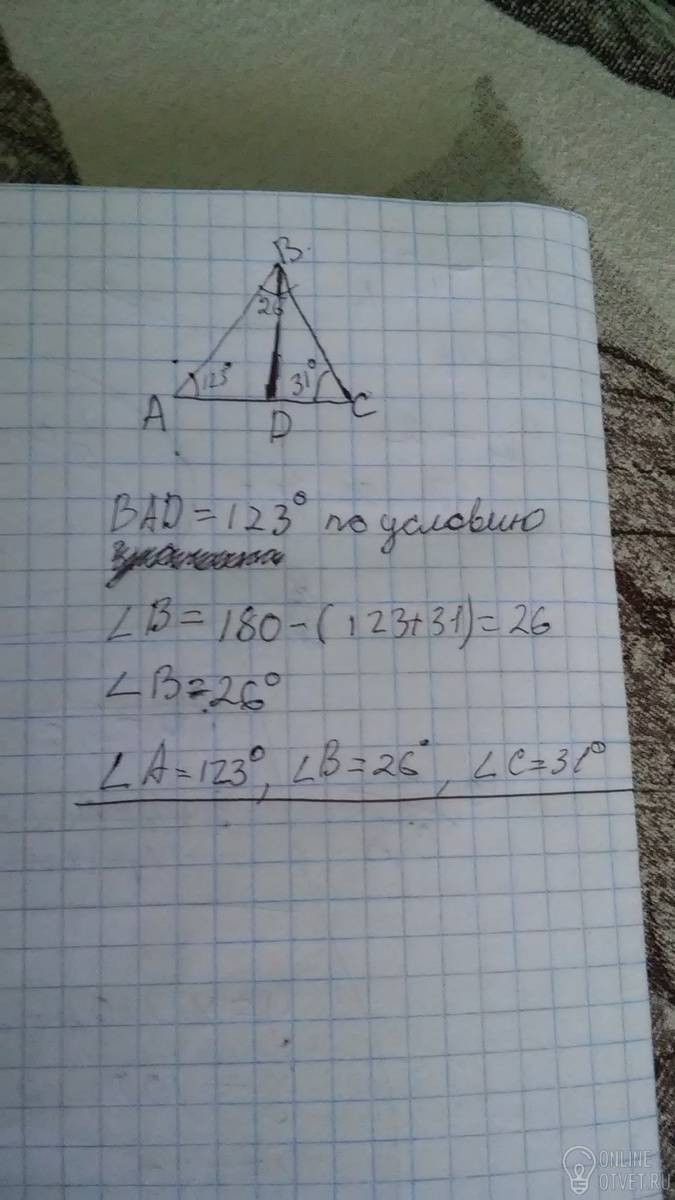 УголС=31 градус уголыBAD=123градус найти неизвестные углы треугольника ABC
