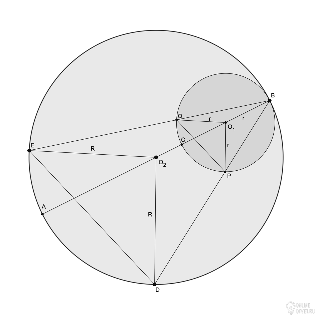 Если обозначить радиус большой окружности R, радиус маленькой r, то BP=2r·cos∠ABD, BD=2R·cos∠ABD. Значит BP/BD=r/R. Аналогично, BQ=2r·cos∠ABE, BE=2R·cos∠ABE. Значит BQ/BE=r/R, т.е. BP/BD=BQ/BE. Т.е.треугольники PBQ и DBE подобны по углу и двум прилажащим пропорциональным сторонам. Значит их соответствующие углы равны, т.е. ∠BED=∠BQP и ∠BDE=∠BPQ.