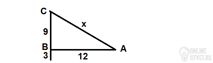 От столба высотой 12 м к дому натянут провод, который крепится на высоте 3 м от земли (см. рисунок). Расстояние от дома до столба 12 м. Вычислите длину провода. Ответ дайте в метрах.