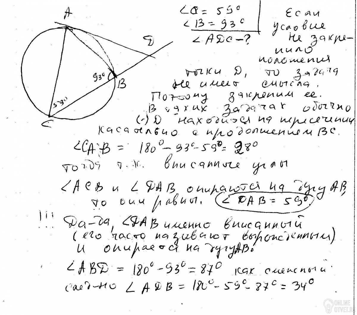 Треугольник ABC вписан в окружность. DA-касательная. Угол C=59 градусов,угол В=93 градуса. Найдите угол ADC. Ответ дайте в градусах.