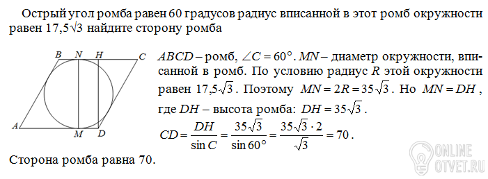 Острый угол ромба равен 60 градусов радиус вписанной в этот ромб окружности равен 17,5√3 найдите сторону ромба