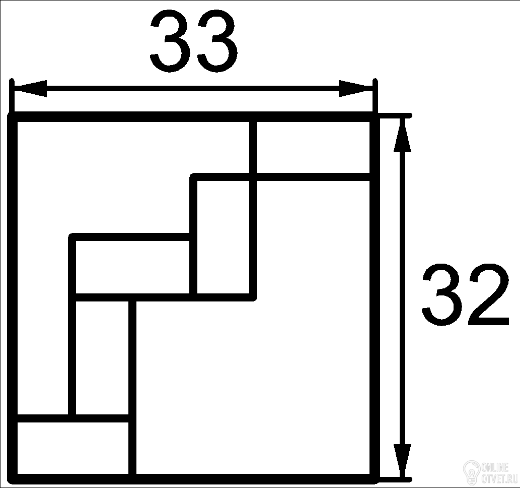 Если посмотреть по картинке, примерно длина мал. прям. = 33/3=11, а по другой стороне 2 ширины+ 2 длины = 32, т.е. 22+2х=32, 2х=10, х=5, значит площадь прямоугольника будет равна 5*11=55