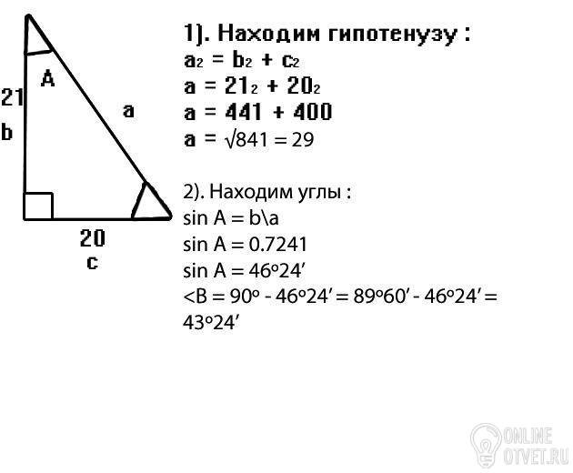 3.Найдите гипотенузу и острые углы прямоугольного треугольника, если его катеты равны 20 см и 21 см.