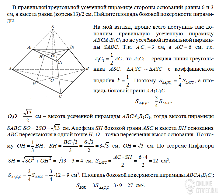 Срочно. С полным ходом решения и пояснениями.<br /> 1) В правильной треугольной усеченной пирамиде стороны оснований равны 6 и 3 см, а высота равна (корень13)/2 см. Найдите площадь боковой поверхности пирамиды. p.s. если что данная высота не пойдет для вычисления площади боковой грани. ( Нужна вроде апофема)