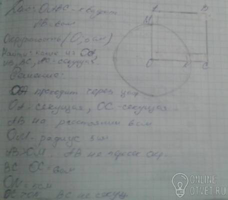 Даны квадрат ОАВС, сторона которого равна 6 см, и окружность с центром в точке .О радиуса 5 см. какие из прямых ОА, АВ, ВС и АС являются секущими по отношению к этой окружности