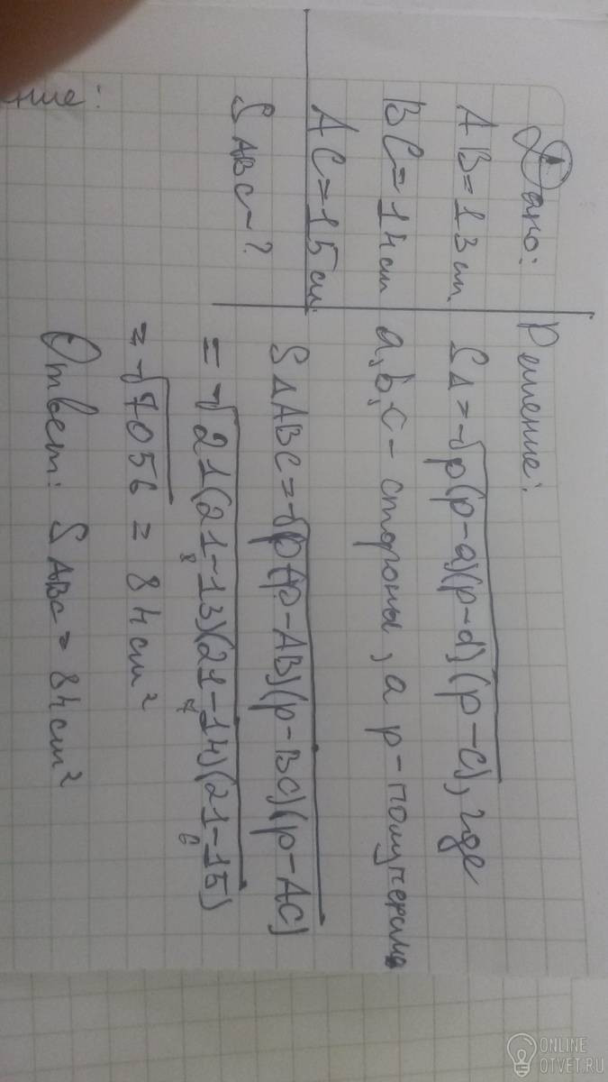 В треугольнике ABC сторона AB=13 см ,BC=14 см ,AC=15 см.Найдите площадь треугольника ABC.Решение пожалуйста
