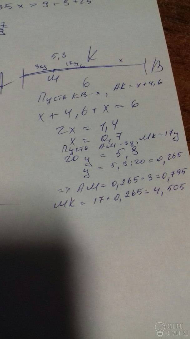 Точка K принадлежит отрезку AB, AB= 6 см причём AK больше BK на 4.6 см Точка M принадлежит отрезку AK причём AM:MK=3:17. Найти длины отрезков