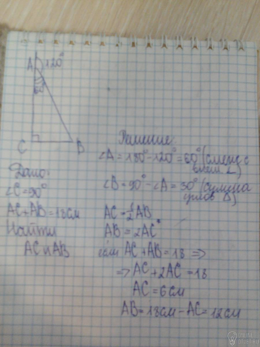 В прямоугольном треугольнике ABC с прямым углом С внешний Угол при вершине А равен 120, АС+АВ=18см.Найти AC и AB