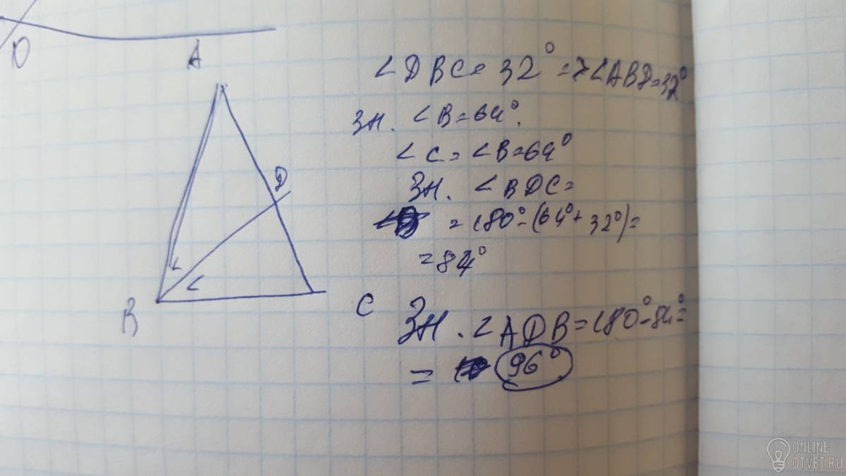 В равнобедренном треугольнике ABC проведена биссектриса BD.Найдите угол ABC и угол ADB,если угол DBC равен 32