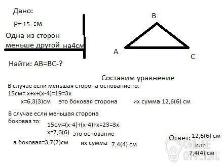 Периметр равнобедренного треугольника равен 15 см, а одна из его сторон на 4 см меньше другой. найдите сумму боковых сторон этого треугольника?