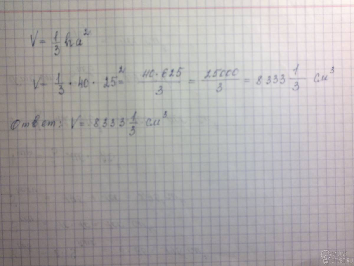 Стороны основания правильной четырехугольной пирамиды равна 25см высота 40 см найдите объем