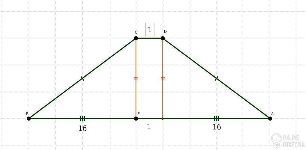 Высота равнобедренной трапеции, проведенная из вершины C, делит основание AD на отрезки длинной 16 и 17 найти BC