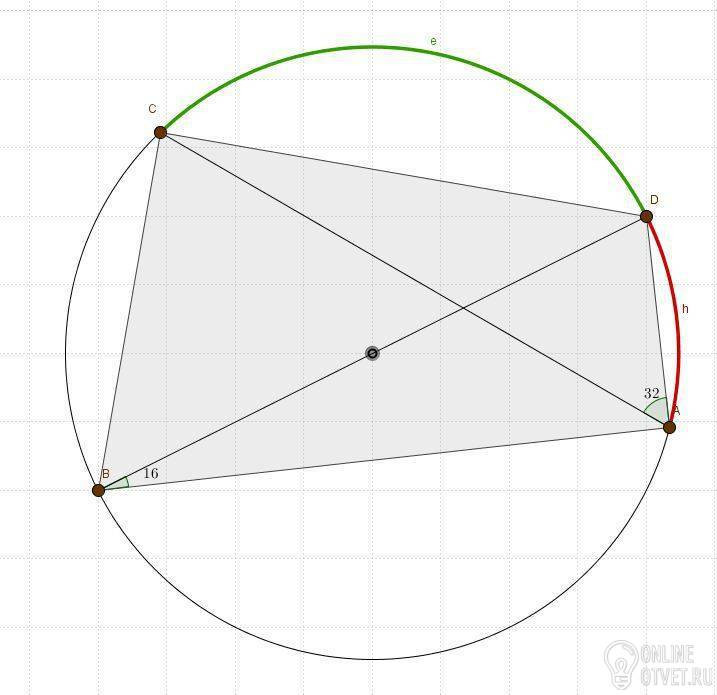 Что мы имеем: угол ABD=16° опирается на дугу h (выделена красным), а угол CAD=32° опирается на дугу (выделена зелёным). А угол, который мы ищем, опирается на две эти дуги вместе. Есть нехитрая теорема, которая гласит, что этот угол есть сумма дуг, т. е. сумма углов 32° и 16°. Значит, ответ — 48°.