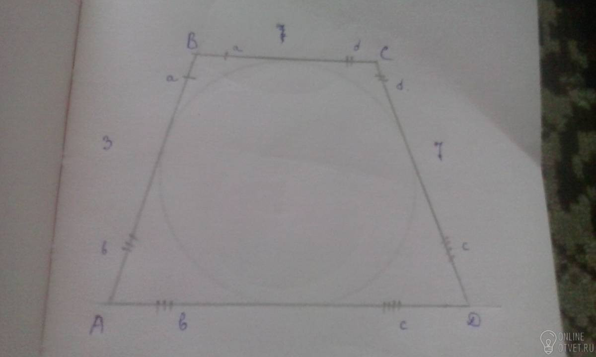 Найти периметр четырехугольника ABCD описанного около окружности если сторона AB=3 , CD=7