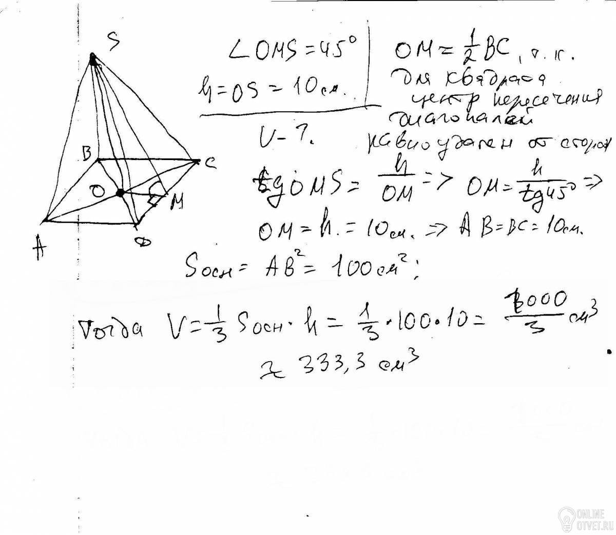 Правильная 4угольная пирамида имеет высоту равную 10см и образует с боковым ребром угол 45 градусов . Найти объем пирамиды , желательно с рисунком