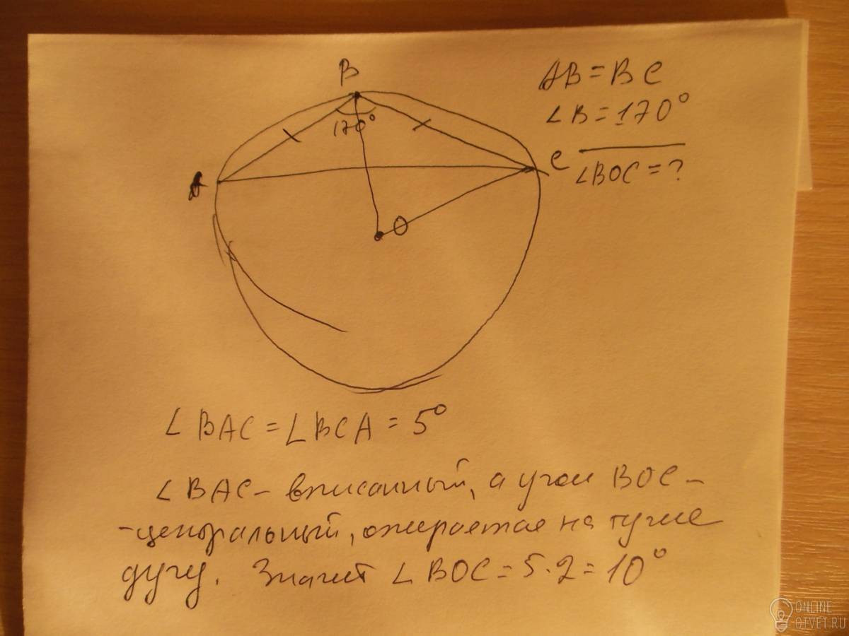 Окружность с центром в точке О описана около равнобедреннего треугольника ABC,в котором АВ=ВС и угол АВС=170 градусов.найдите величину угла ВОС.