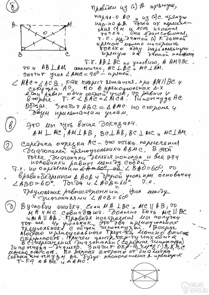 д)Можно ли провести окружность через точки А,В,С,М, если точка М расположена вне треугольника АВС и МА перпендикулярно ВС, МС параллельно АВ.