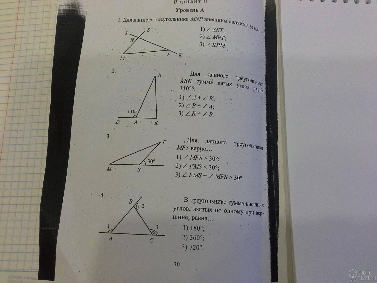 1) ответ 3) КРМ; 2) ответ 3) К+В; 3) ответ 2) FMS<30°; 4) ответ 2) 360°; угол1=В+С; угол2=А+С; угол3=А+В; В+С+А+С+А+В=180+180=360°;