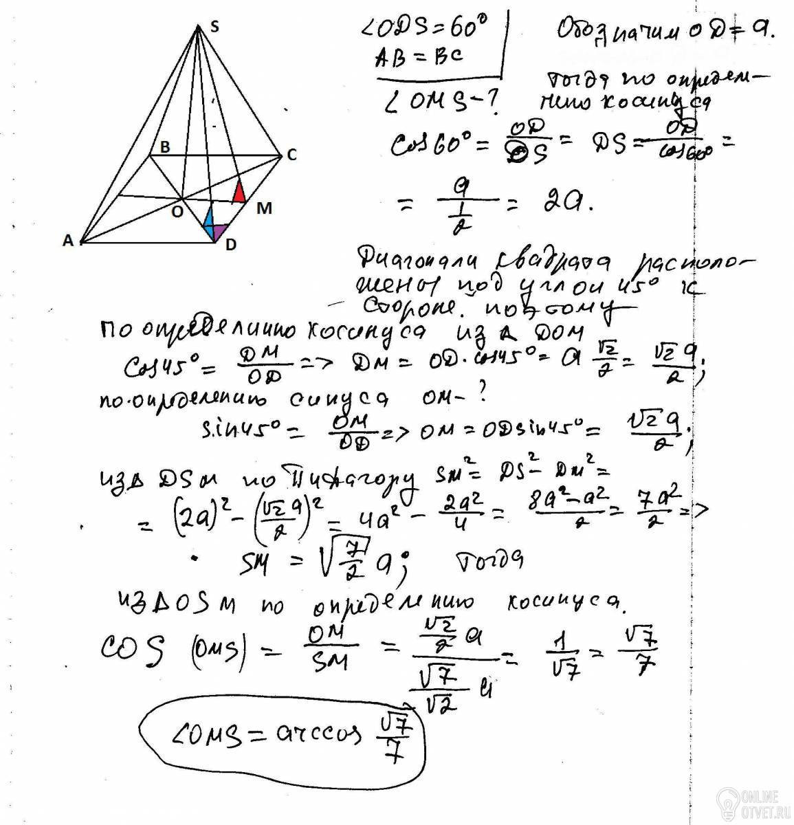 5)найдите величину двугранного угла при основании правильной четырехугольной пирамиды если её боковые ребра наклонены к плоскости основания под углом 60 градусов