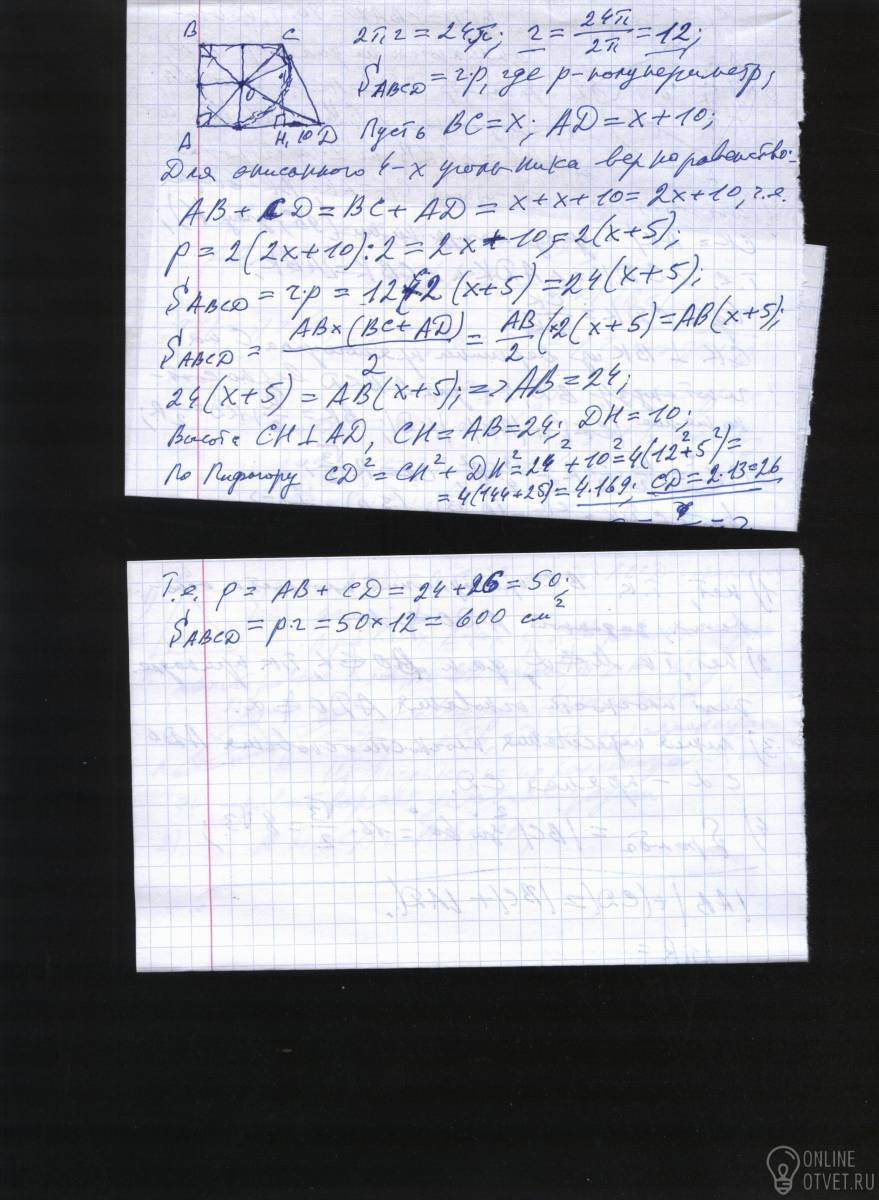 7. Длина круга, вписанного в прямоугольную трапецию, равна 24π см. Вычислите площадь трапеции, если ее нижнее основание на 10 см больше верхней.