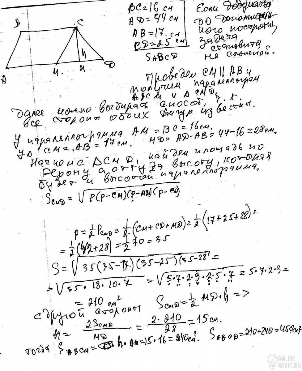 1) Основания трапеции равны 16 и 44 см, а боковые стороны – 17 и 25 см. Найдите площадь трапеции.