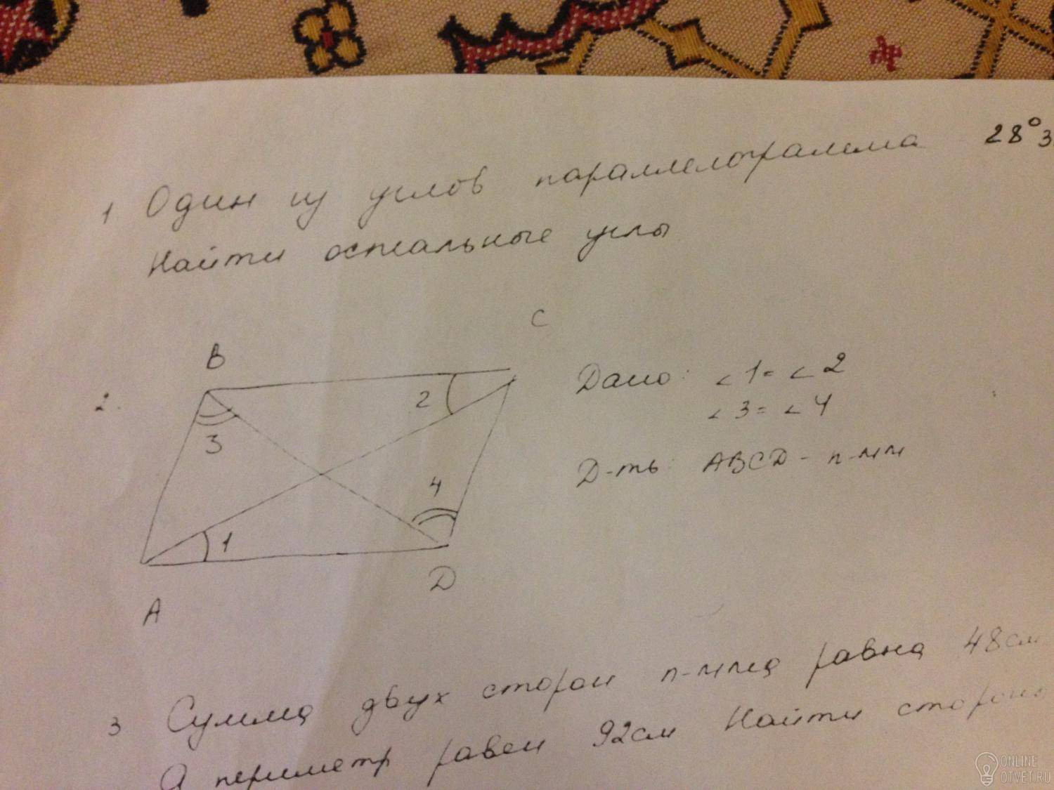 Против равных углов лежат разные стороны ,то AB=CD,AD=CB. ABCD параллелограмм по второму признаку параллелограмма